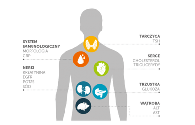 11 badań laboratoryjnych informujących o Twoim stanie zdrowia: białko ostrej fazy - CRP, morfologia pełna, kreatynina, potas, sód, hormon tyreotropowy – TSH, cholesterol całkowity, trójglicerydy TG, glukoza na czczo we krwi żylnej, aminotransferaza asparaginianowa - AST, aminotransferaza alaninowa - ALT.